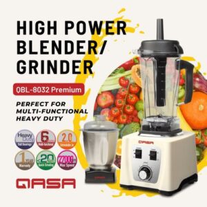 Introducing the QASA QBL-8032 Blender, a powerful 1500W appliance with a peak power of 1800W. It features a 2.0L jar, 3.0L cup, and 27000rpm speed. Durable with a 304 stainless steel grinding cup, alloy diecast transmission base, and 6-blade knife set. It offers stepless speed regulation, a turbo switch, and a heavy-duty motor with a 100% pure copper coil. Perfect for smoothies, ice crush, juices, soups, and batters. Specifications: - Rated power: 1500W - Max power: 1800W - Jar volume: 2.0L - Cup volume: 3.0L - Grinding cup: 800ml - Speed: 27000rpm (max) - Stainless steel grinding cup - Alloy diecast transmission base - 6-blade knife set - Stepless speed regulation - Turbo switch - Pure copper coil motor