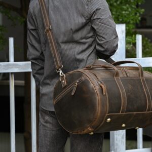 Product information: Lining texture: polyester cotton Color: 3843-dark brown Leather features: first layer cowhide Accessory type: shoulder strap Function: wear-resistant, anti-theft Material: genuine leather Size: 21 inches Capacity: 20-35L Size: Packing list: 1PC*Travel messenger bag Product Image:
