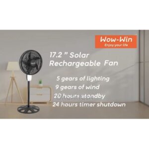 Product Details The 17.2-Inch LED Light Rechargeable Remote Fan is a versatile and convenient cooling solution perfect for a variety of settings, from home use to outdoor activities. This fan combines powerful airflow, energy-efficient LED lighting, and the convenience of a rechargeable battery, making it an ideal choice for ensuring comfort wherever you go. With the added feature of remote control, adjusting the fan's settings is effortless. Product Features 17.2-Inch Fan Diameter The fan features a 17.2-inch diameter blade, providing a strong and consistent airflow to keep you cool. LED Lighting Integrated LED lights offer bright and energy-efficient illumination, making this fan perfect for use in low-light conditions or during power outages. Rechargeable Battery The fan is equipped with a high-capacity rechargeable battery, ensuring long-lasting operation without the need for a constant power supply. This makes it perfect for use during outdoor activities, camping trips, or in areas with frequent