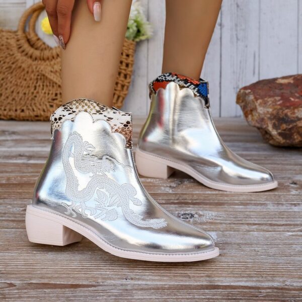 Women’s Pointed-toe Stitching Embroidered Chunky Heel Chelsea Mid-calf Boots